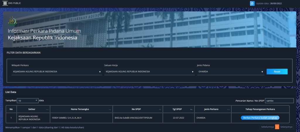 JAM Pidum menyatakan berkas perkara dugaan pembunuhan Brigadir Yosua dengan lima orang telah lengkap. Para tersangka itu ialah Ferdy Sambo, Putri Candrawathi, Kuat Ma’ruf, Bripka Ricky Rizal, dan Bharada Eliezer.