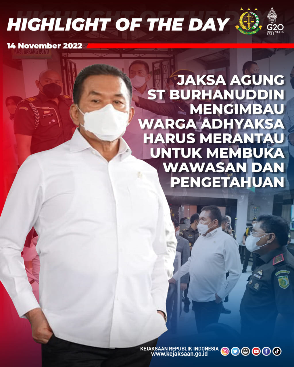 Senin 14 November 2022, dalam kunjungan kerja Jaksa Agung ST Burhanuddin di Kejaksaan Tinggi Bengkulu dan Kejaksaan Negeri Bengkulu Kota, yang didampingi oleh Kepala Biro Umum, Kepala Biro Kepegawaian, Kepala Pusat Penerangan Hukum, dan Asisten Umum Jaksa Agung, dengan bersenda gurau Jaksa Agung menyampaikan bahwa untuk meningkatkan kapasitas pengetahuan dan kemampuan (skill), warga Adhyaksa harus keluar dari daerahnya dengan harapan tidak saja melihat Kejaksaan begitu luas tapi juga menikmati ciptaan Tuhan yang luar biasa yaitu Indonesia nan luas dan indah.