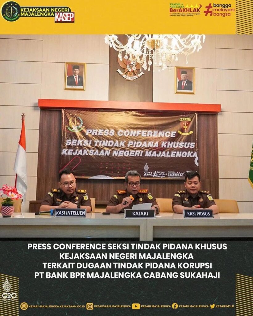 Pada Hari Kamis Tanggal 13 Oktober 2022, Penyidik Kejaksaan Negeri Majalengka Menahan 2 (dua) orang Tersangka dengan inisial “F” dan Tersangka “Y” dalam perkara Dugaan Tindak Pidana Korupsi Pemberian Pinjaman Dana Nasabah Pada Perumda BPR (Bank Perkreditan Rakyat) Majalengka Cabang Sukahaji Tahun 2018 – 2019 kepada 182 (seratus delapan puluh dua) debitur dengan jumlah total dana pinjaman sebesar Rp. 4.577.500.000,- (empat milyar lima ratus tujuh puluh tujuh juta lima ratus ribu rupiah) yang diduga terdapat penyalahgunaan penyaluran kredit dengan cara pemalsuan agunan, tidak dilakukan survey dan kredit topengan yang menyebabkan kredit macet sehingga menimbulkan kerugian keuangan Negara sebesar 3,261,697,900,- (tiga milyar dua ratus enam puluh satu juta enam ratus sembilan puluh tujuh ribu sembilan ratus rupiah).